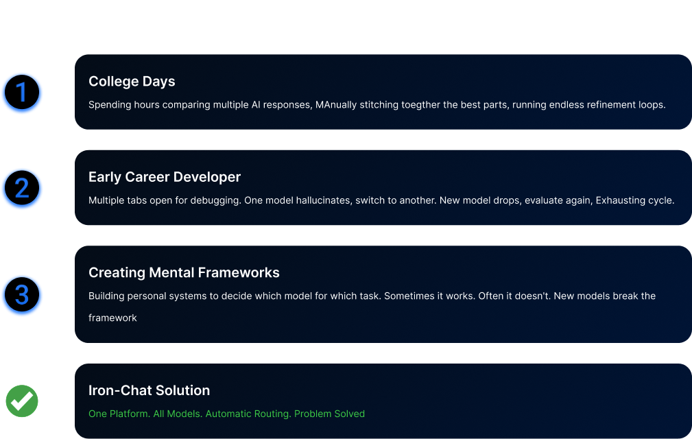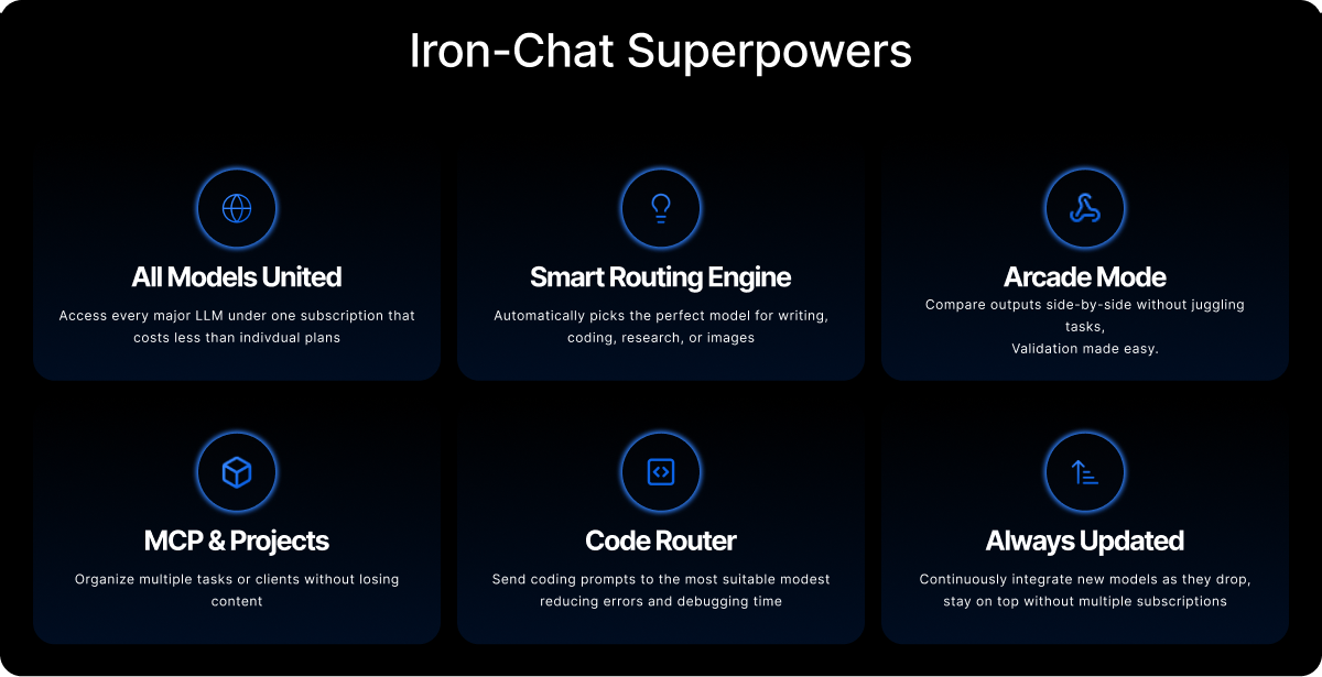 Iron-Chat isn’t stopping at chat. Projects, MCP support, Code Router, and much more are coming to make your workflow even smoother. Organise work, run multi-step tasks, and integrate code intelligently, all without worrying about which AI model to pick or switching tabs endlessly.